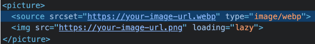You can make use of picture tags to handle browser compatibility. The picture tag will take source as default way to render image. So we give the WebP image URL to the source.